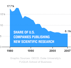 假如將歷史周期再拉的長(zhǎng)一點(diǎn),從1980年到2007年,美國(guó)在研發(fā)上的本錢比重,降低的速度已然讓人驚奇。尤其是參考在新科學(xué)研究領(lǐng)域的專業(yè)文章數(shù)目來看,已然從17.7%下降到了6.1%。杜克大學(xué)的研究教授Ashish Arora表示,從資本市場(chǎng)的反饋來說,越是注重研發(fā)的企業(yè)的市值,反而不如在研發(fā)上投入較小的企業(yè)的市值評(píng)估。他說,相對(duì)于35年之前,現(xiàn)在的企業(yè)對(duì)于基礎(chǔ)科學(xué)的看重減少了,而需求就更少了。