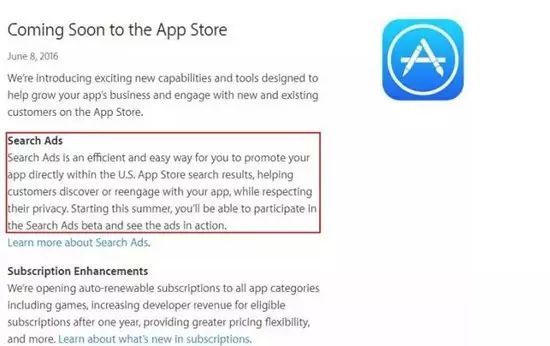 付費推廣 App 展現方式示意圖 另外,每一個搜索結果頁面只會泛起一個付費推廣的 App,蘋果會以類似 Google Adwords 的付費網絡推廣系統(tǒng)來決定哪些應用泛起在用戶的搜索頁面。 2015年,全球蘋果用戶在 App Store 消費的金額超過200億美元,可用的 App 更是多達190萬種,這也導致了應用曝光的難度加大,良多開發(fā)者反映,在 App Store 上應用曝光的機會越來越少,也越來越難題,甚至催生了大量的第三方刷榜機構,這不管是對于用戶仍是開發(fā)者都并非好事。蘋果表示,這次新增的付費推廣功能將可以匡助更多的 App 取得曝光的機會,也可以讓用戶更利便的獲取到優(yōu)秀的應用。 蘋果官方公布, App Store 2.0 將會首先在北美進行測試,在今年秋季正式上線。 |