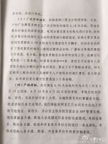 當(dāng)前,競爭日趨慘烈的“6.18”大戰(zhàn)終于落下帷幕,各大電商平臺(tái)紛紛曬出自己的“成績單”。根據(jù)農(nóng)村淘寶宣布的數(shù)據(jù),家電類產(chǎn)品在今年618期間銷量最佳,農(nóng)村淘寶好像已儼然成為家電數(shù)碼產(chǎn)品下鄉(xiāng)的主陣地。 然而,在阿里村淘看似繁榮的營銷數(shù)據(jù)背后,卻躲藏著行政干涉干與這只怪手。據(jù)傳,山西孝義市近期就發(fā)布了一份令人咋舌的文件,要求下級(jí)單位配合完成阿里村淘6.18交易額等指標(biāo)。 一、為推進(jìn)阿里村淘項(xiàng)目,孝義市強(qiáng)制向下攤派消費(fèi)指標(biāo) 日前,網(wǎng)絡(luò)上曝出一份山西省孝義市電子商務(wù)領(lǐng)導(dǎo)小組下發(fā)的紅頭文件,引來網(wǎng)友的廣泛關(guān)注和吐槽。文件內(nèi)容顯示,該市要求下級(jí)單位完成農(nóng)村淘寶在6.18期間的APP安裝量和交易額指標(biāo)。 詳細(xì)來看,孝義市擬定在2016年6月1日至19日期間,完成“安裝綁定農(nóng)村淘寶APP 7萬個(gè),商品交易額達(dá)到2600萬元”的目標(biāo)任務(wù)。為此,孝義市將指標(biāo)細(xì)化后,對(duì)市委、宣傳部等機(jī)關(guān)及企事業(yè)單位下發(fā)了明確的任務(wù)指標(biāo),甚至轄下的各鄉(xiāng)鎮(zhèn)、礦區(qū)和學(xué)校都被分配了上百、上千的APPA綁定任務(wù)。 同時(shí),孝義市要求各鄉(xiāng)鎮(zhèn)、街道和市直有關(guān)單位分別進(jìn)行一條龍排隊(duì),考核成績納入年終責(zé)任制考核。考核依托阿里巴巴公司為大會(huì)戰(zhàn)工作領(lǐng)導(dǎo)組組長、副組長、辦公室主任分別安裝后臺(tái)APP治理系統(tǒng),隨時(shí)把握各單位任務(wù)目標(biāo)完成情況。