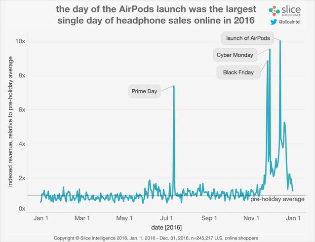 蘋果公司CEO Tim Cook在2016年12月底,對(duì)發(fā)售尚不滿一個(gè)月的AirPods銷量表示滿足,以為AirPods是大獲成功的產(chǎn)品,不外由于蘋果公司沒有宣布數(shù)據(jù),除了eBay上有人加價(jià)出售AirPods的側(cè)面信息證實(shí)AirPods的確受歡迎外,分析師也無法判定AirPods的詳細(xì)銷售情況。 市場調(diào)研公司Slice Intelligence近日發(fā)布的講演證明了Tim Cook的說法,AirPods一個(gè)月的時(shí)間占據(jù)了26%的市場份額,可以說蘋果公司的品牌和眾多iOS用戶改變了無線耳機(jī)市場的格式。在AirPods發(fā)售之前,蘋果此前花費(fèi)30億美元收購的Beats之前占據(jù)市場24.1%的份額,排名第一,緊隨其后的是占10.5%的Bose耳機(jī),以及占7.8%的Plantronics耳機(jī)。 從數(shù)據(jù)感慨感染下AirPods是多么受歡迎: