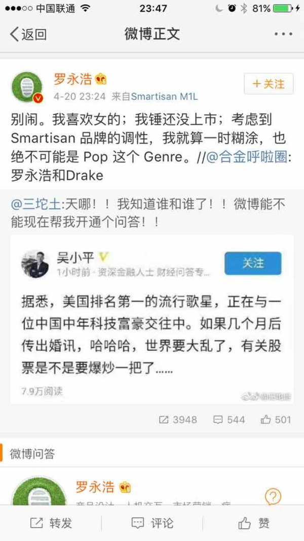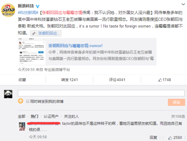今日,張朝陽突然登上了新浪微博熱搜,是不是決定滿臉問候,搜狐老邁在新浪微博火了?這兩貨不是競爭對手嗎?近日,網(wǎng)上瘋傳某我國中年科技富豪與美國第一流行歌星相戀,網(wǎng)友紛紛猜想這是暗指搜狐CEO張朝陽與美國歌星是霉霉。但遭遇張朝陽強(qiáng)勢否定,稱“我不認(rèn)識她,對外國女性沒興趣”。 這下網(wǎng)友評論的更熱鬧了,有霉霉粉絲出來辯駁稱taylor的品嘗不止如此,看她歷屆男朋友就知道,并且她自個有錢的很,言下之意即是霉霉還看不中張朝陽呢。 一起有人為霉霉抱屈,稱張朝陽急著跳出來回答給自個加戲,正本張朝陽不出來回答,沒人專注這個事,也上不了熱搜,他出來加個戲,鍋還要女方背。 相較于粉絲的嘴炮,筆者更關(guān)心的是這場緋聞的真實(shí)性,究竟是確有其事,仍是一場營銷呢?如果不是空穴來風(fēng),這個中年科技富豪究竟是誰呢? 有趣的是,在緋聞事件還沒有多少人重視的時分,錘子科技的羅永浩第一時間跳出來撇清聯(lián)系表明:“別鬧,我喜愛女的……我就算一時糊涂,也絕不可能是Pop這個Genre。”被網(wǎng)友戲稱活潑得像高仿號。 聯(lián)系我國互聯(lián)網(wǎng)、中年、對股票有影響、富豪,本身契合條件的就沒幾個。 首要必定不是雷軍,由于雷軍英語不行。 劉強(qiáng)東和奶茶妹妹好著呢,也不太像。 難道是常往美國跑的賈躍亭?但現(xiàn)在的樂視風(fēng)波不斷,近期和易道的“羈絆”想必夠讓賈躍亭焦頭爛額了,賈躍亭的可能性也不大。 值得注意的事,在導(dǎo)致廣泛重視之后,爆料的原博就刪掉了這條微博,難道這次爆料是坑爹的?圍觀大眾怎么看? |