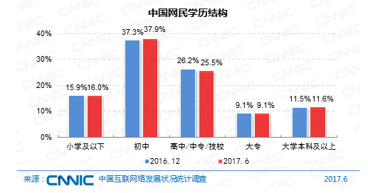 在學(xué)歷構(gòu)成上,我國網(wǎng)民依然以中等學(xué)歷集體為主,初中、高中/中專/技校學(xué)歷的網(wǎng)民占比別離為37.9%、25.5%。與2016年末比較,網(wǎng)民的學(xué)歷結(jié)構(gòu)改變不大。