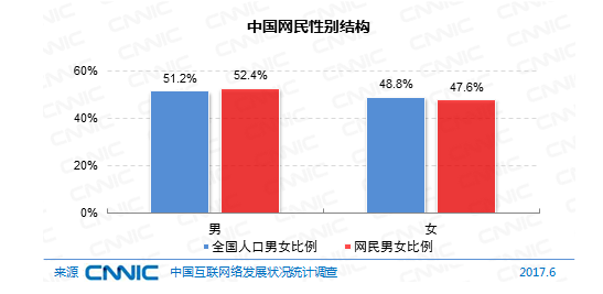 在性別構(gòu)成上,我國網(wǎng)民男女份額為52.4:47.6,同期全國人口男女份額為51.2:48.8,網(wǎng)民性別結(jié)構(gòu)趨向均衡,且與人口性別份額根本共同。