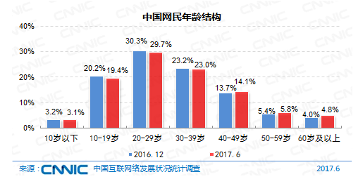 在年紀(jì)構(gòu)成上,我國網(wǎng)民仍以10-39歲集體為主,占全體的72.1%:其間20-29歲年紀(jì)段的網(wǎng)民占比最高,達(dá)29.7%,10-19歲、30-39歲集體占比別離為19.4%、23.0%。與2016年末比較,40歲及以上中高齡集體占比添加1.7個(gè)百分點(diǎn),互聯(lián)網(wǎng)繼續(xù)向這個(gè)年紀(jì)集體浸透。