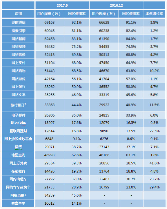 2017年上半年,我國個(gè)人互聯(lián)網(wǎng)運(yùn)用堅(jiān)持快速開展,其間網(wǎng)上外賣和互聯(lián)網(wǎng)理財(cái)是添加最快的兩個(gè)運(yùn)用,半年添加率別離為41.6%和27.5%,網(wǎng)絡(luò)購物仍堅(jiān)持較快添加,半年添加率為10.2%;手機(jī)運(yùn)用方面,手機(jī)外賣、手機(jī)在線教育課程用戶規(guī)劃添加最為顯著,半年添加率別離為41.4%和22.4%。