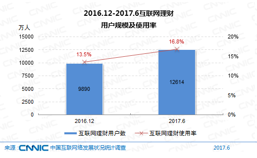 到2017年6月,我國購買互聯(lián)網(wǎng)理財(cái)產(chǎn)品的網(wǎng)民規(guī)劃到達(dá)1.26億,較2016年末添加用戶2724萬人,網(wǎng)民運(yùn)用率從13.5%升至16.8%。