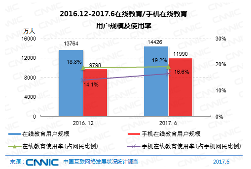 到2017年6月,我國在線教育用戶規(guī)劃達(dá)1.44億,較2016年末添加662萬人,半年添加率為4.8%;在線教育用戶運(yùn)用率為19.2%,較2016年末添加0.4個(gè)百分點(diǎn)。其間,手機(jī)在線教育用戶規(guī)劃為1.20億,與2016年末比較添加2192萬人,添加率為22.4%;手機(jī)在線教育用戶運(yùn)用率為16.6%,比較2016年末添加2.5個(gè)百分點(diǎn)。