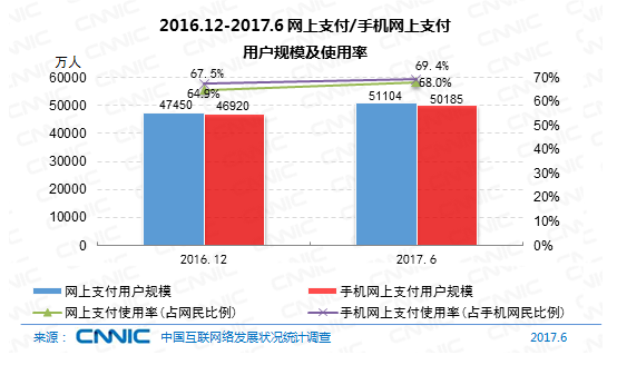 到2017年6月,我國運(yùn)用網(wǎng)上付出的用戶規(guī)劃到達(dá)5.11億,較2016年12月,網(wǎng)上付出用戶添加3654萬人,半年添加率為7.7%,我國網(wǎng)民運(yùn)用網(wǎng)上付出的份額從64.9%提高至68.0%。其間,手機(jī)付出用戶規(guī)劃添加迅速,到達(dá)5.02億,半年添加率為7.0%,網(wǎng)民手機(jī)網(wǎng)上付出的運(yùn)用份額由67.5%提高至69.4%。