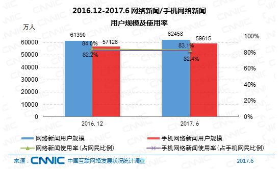 到2017年6月,我國網(wǎng)絡(luò)新聞?dòng)脩粢?guī)劃為6.25億,半年添加率為1.7%,網(wǎng)民運(yùn)用份額為83.1%。其間,手機(jī)網(wǎng)絡(luò)新聞?dòng)脩粢?guī)劃到達(dá)5.96億,占手機(jī)網(wǎng)民的82.4%,半年添加率為4.4%。