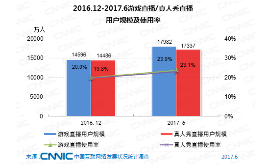 別的值得注意的是,到2017年6月,網(wǎng)絡(luò)直播用戶共3.43億,占網(wǎng)民全體的45.6%;而到2016年12月,網(wǎng)絡(luò)直播用戶規(guī)劃到達(dá)3.44億,占網(wǎng)民全體的47.1%。與半年前比較,網(wǎng)絡(luò)直播的用戶規(guī)劃和在網(wǎng)民中的全體占比皆呈現(xiàn)下降。