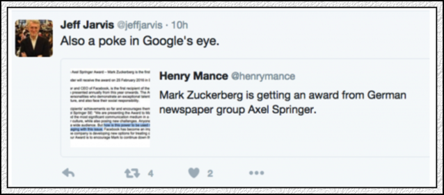 【圖說:在谷歌陣營的人看來,這場流動來者不善。聞名的親谷歌學(xué)者杰夫·杰維斯開玩笑說:這不是戳谷歌的眼睛嗎!】 谷歌是傳統(tǒng)媒體的敵人,臉書也是。不外,此一時,彼一時,合縱聯(lián)橫的政治婚姻、神圣聯(lián)盟隨時都會泛起。傳統(tǒng)媒體指望通過這樣的借力使力,在縫隙間生存,讓自己借機(jī)發(fā)展壯大,是一廂情愿的。但是,傳統(tǒng)媒體的確不能關(guān)起來門來自娛自樂,孤芳自賞,必需與狼共舞,踩著高科技的節(jié)奏飛上一會。 此外,高科技巨頭們對于新聞業(yè)發(fā)展的貢獻(xiàn),也是無法無視的,事實上,后人們在撰寫新聞史的時候,谷歌、臉書這些門外的野蠻人將成為當(dāng)然的主角,全球各地精英新聞學(xué)院出身的精英專業(yè)人士,從來不是新聞史臺面上確當(dāng)然主角,也永遠(yuǎn)不會是(很殘酷,是不是?但符合顛覆者不來自內(nèi)部的鐵律)。施普林格把第一個施普林格獎頒給小扎,小扎當(dāng)之無愧。而那個沒有泛起在頒獎儀式上助興的谷歌,假如馬塞亞斯·多夫納足夠大度的話,同樣應(yīng)該在某年授與其一個大獎。由于,谷歌對于新聞業(yè)的發(fā)展作出的貢獻(xiàn),比臉書早,迄今為止,也一點不比臉書小。當(dāng)然,谷歌對于新聞業(yè)的轔轢與臉書一樣,怎么評估都不會過份。 歷史,不都是以這樣的方式寫就的嗎? 稍等,新聞業(yè)(journalism)這個詞在有了谷歌與臉書之后,是不是需要重新定義了?在中國,有了早年的新浪、網(wǎng)易、搜孤,稍后的 BAT 之后,是不是也需要重新定義了?新聞早就不是原來的那個新聞,新聞業(yè)也早就不再是早先的那個新聞業(yè)了。