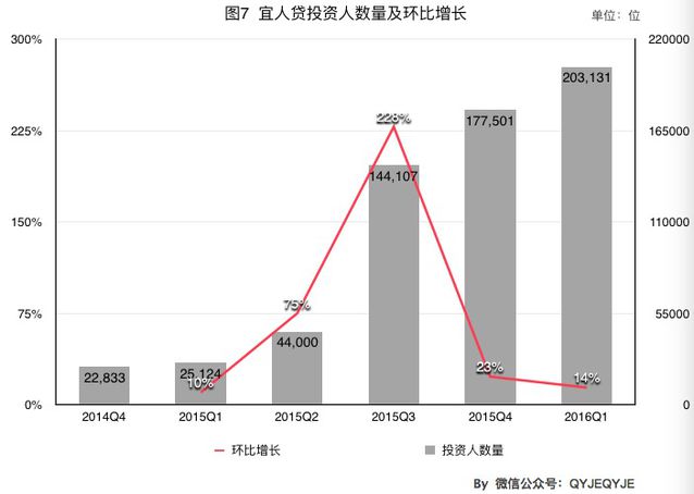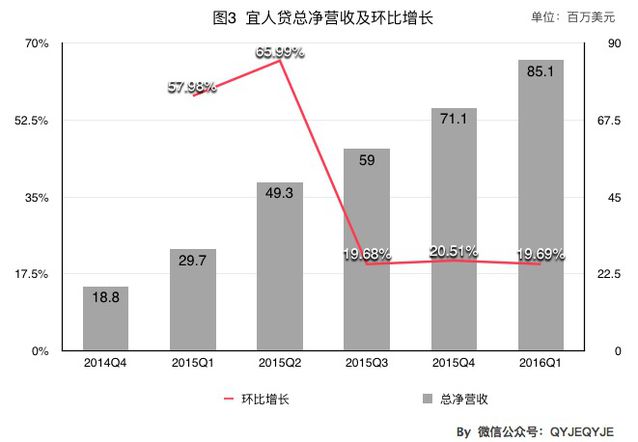 圖中紅框部門顯示,在Q2季度,Deferred revenue(遞延收入)和Cash revenue泛起失常,不遵循相關會計配比原則。 而風險預備金項,基本維持在總收費額的30%左右,符合配比原則。 (遞延收入,是暫時未確認的收益意思,由權責發(fā)生制和收付實現(xiàn)制的暫時性差異產(chǎn)生)。 因此,我們發(fā)現(xiàn)了秘密所在:宜人貸通過調整遞延收入確認時間以及人為控制的現(xiàn)金激勵,調整了會計利潤,以符合相關上市要求。 這也解釋了,為什么凈利潤和總凈營收,會在Q2季度泛起意外不符合相關會計規(guī)律的現(xiàn)象。 在以后解讀宜人貸財報,這兩個數(shù)據(jù),將是考驗利潤“含金量”相對有效的地方。 在2016Q1季度,同比增速情況如下: