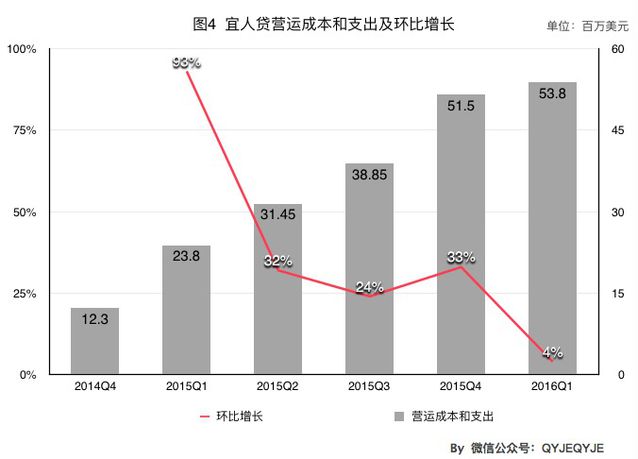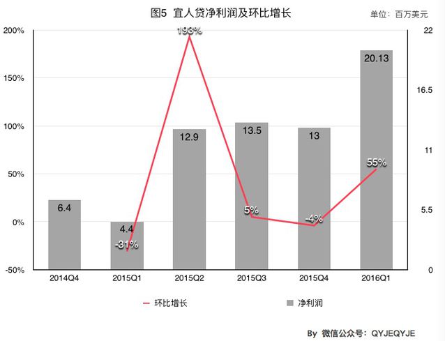 (注:總收費額,意思毛收入總額,有兩個來源部門,一是來自借錢的人,另一部門來自投資的人,其中借錢的人,占大頭。也即從事中介借貸服務,兩端收取的手續(xù)費,為其所有收入) 然而這樣一種變化趨勢,無疑是難以讓資本市場滿足的。 對于各家P2P平臺而言,平臺的借款總額,就猶如電商行業(yè)的GMV,體量和增速對公司在資本市場估值尤為致命。 作為一家奔跑著的創(chuàng)業(yè)公司,它的環(huán)比增長速度,卻泛起大幅度下滑。這是一個非常致命的信號。 假如后期發(fā)展增速繼承疲軟,那么華爾街將改變對其估值模型:由高速成長模型轉變?yōu)槌墒炀徛l(fā)展模型。 公司發(fā)展速度,回到社會資本均勻增長水準;股價也回調至緩慢上漲。 當然,下一階段考慮到?jīng)]有了春節(jié)這個季節(jié)因素影響,個人以為存在一定的止跌可能; 然而,對于最近這段時間美國嚴肅的監(jiān)管立場,LC丑聞、海內糟糕的投資環(huán)境,2016Q2季度的表現(xiàn),應該不會比Q1季度好到哪里去。 對于資本市場而言,宜人貸發(fā)展遠景、想象力確實十分有限,股價不會泛起大幅上揚。 看點二:凈利潤表現(xiàn)搶眼,原來是存在很顯著的“操作利潤”情況