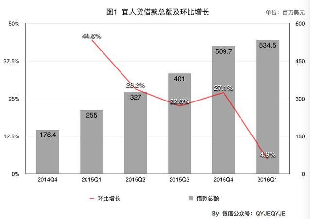 近期,跟著P2P標桿Lending Club的隕落,股價斷崖式暴跌,9年的co-founder and CEO被逐出公司,fintech概念從神壇走下; 美國財政部隨后于5月10日發(fā)布網(wǎng)貸白皮書,題為“網(wǎng)絡市場化信貸的機遇與挑戰(zhàn)”(Opportunities and Challenges in Online Marketplace Lending),闡述對行業(yè)擔憂,政策風口一再走緊; 雪上加霜的是,Google也于昨天晚間公布“下架小貸廣告”,成為壓垮美帝網(wǎng)貸的最后一根稻草,行業(yè)遠景堪憂。 而與此同時,大西洋彼岸擁有中國特色的P2P公司——宜人貸,高調發(fā)布了自己2016年Q1季度財報,華麗的數(shù)字,使得股價也應聲上漲5.83%。 本文將圍繞這一季財報,展開分析,探討財報數(shù)字背后,這家P2P公司詳細的發(fā)展情況。 財務業(yè)績分析 看點一:借款總額、總收費額,持續(xù)增長;環(huán)比增長,駛入慢車道 先來看每季度借款總額變化情況,如下圖1