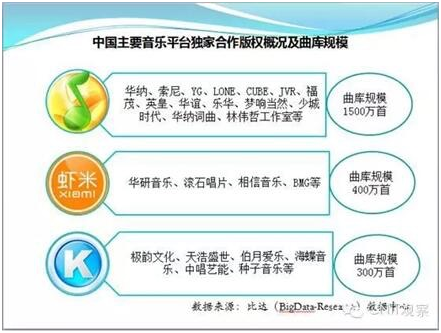 事實(shí)上,一張數(shù)字專輯的銷量可以反映出一家音樂平臺(tái)的多個(gè)方面。好比,首先可以反映出的是一家音樂平臺(tái)的人氣和用戶規(guī)模。從上述對(duì)比不丟臉出,QQ音樂顯然比酷狗擁有更為旺盛的人氣和更大的用戶規(guī)模。其次,也反映出一家音樂平臺(tái)的營(yíng)銷力,銷售數(shù)字單曲與網(wǎng)友自行收聽免費(fèi)單曲是完全不同的用戶行為,從上述對(duì)比來(lái)看,QQ用戶的活躍度和消費(fèi)能力更高,而酷狗區(qū)區(qū)不足5萬(wàn)的銷量則反映出了酷狗這家音樂平臺(tái)用戶活躍度和消費(fèi)能力的不足。 實(shí)際上,之所以有這樣的懸殊,主要還在于一家音樂平臺(tái)是否能獲得大牌本身的認(rèn)可和資源整合能力。以張杰為例,與老東家天娛解約后,張杰的新專輯與福茂唱片展開戰(zhàn)略合作,開啟個(gè)人“我想”音樂計(jì)劃。而作為福茂唱片的獨(dú)家版權(quán)合作伙伴,張杰入駐福茂后也獨(dú)家牽手QQ音樂,成為平臺(tái)上又一閃亮的巨星,騰訊公司副總裁彭迦信先生曾在發(fā)布會(huì)現(xiàn)場(chǎng)宣布了張杰首張數(shù)字單曲的預(yù)售成績(jī),最新單曲《我想》僅預(yù)售48小時(shí)就達(dá)50萬(wàn)白金銷量,創(chuàng)造未正式上線就破白金銷量的新紀(jì)錄,白金唱片認(rèn)證也成為QQ音樂送給張杰全新啟航最好的見面禮,而正式上線僅兩天總銷量突破70萬(wàn),音樂價(jià)值得到充分彰顯。 數(shù)據(jù)顯示,作為中國(guó)數(shù)字專輯發(fā)行序幕的開啟者,從2014年底周杰倫的《哎呦,不錯(cuò)哦》開始到2015年,QQ音樂平臺(tái)共計(jì)為近20位歌手發(fā)行共近30張數(shù)字專輯,從首創(chuàng)巨星周杰倫到新偶像鹿晗,再到韓國(guó)天團(tuán)BIGBANG、歐美天后Rihanna,僅一年時(shí)間數(shù)字專輯總銷量突破1000萬(wàn)張,鹿晗和BIGBANG、Rihanna等銷量屢破百萬(wàn)張銷量紀(jì)錄,QQ音樂此舉也被以為,標(biāo)志著中國(guó)數(shù)字音樂時(shí)代的正式來(lái)臨。 而反觀酷狗,在數(shù)字專輯和數(shù)字單曲的發(fā)行力和營(yíng)銷力上仍是力不從心的。 版權(quán)危機(jī) 版權(quán)是一家音樂平臺(tái)的立命之本,用無(wú)版權(quán)不音樂來(lái)形容亦不為過(guò)。目前主要平臺(tái)音樂版權(quán)及曲庫(kù)貯備情況可以從下圖中一探畢竟: