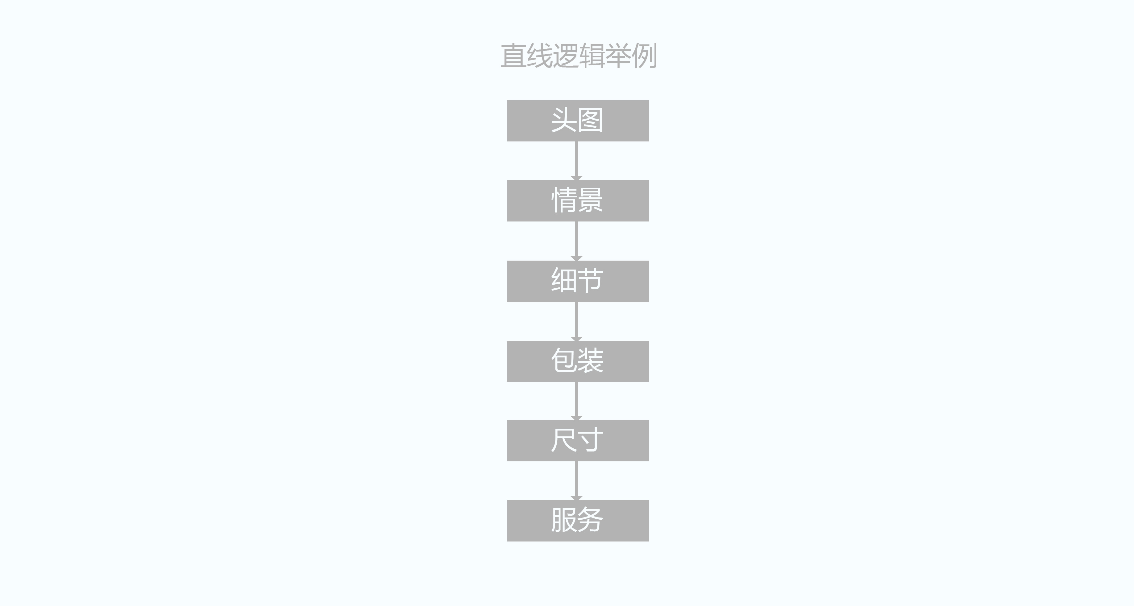 根據(jù)古騰堡圖表的閱讀邏輯來看,這一系列圖片首先從左上角看到的是該品牌的logo,再由閱讀軌跡從對角線視覺中的詞組到右下角的產(chǎn)品,畫面需要夸大的元素都在閱讀邏輯的規(guī)律下展現(xiàn)。其余的視覺盲點(diǎn)則是輔助性元素。 2.直線式邏輯 對于直線式邏輯,我的理解是自上而下猶如權(quán)力分配等級軌制。同工業(yè)鏈一樣,一環(huán)扣一環(huán),每個(gè)環(huán)節(jié)都是緊密相連前后有序,嚴(yán)謹(jǐn)公道。例如一個(gè)產(chǎn)品的頁面詳情如下: