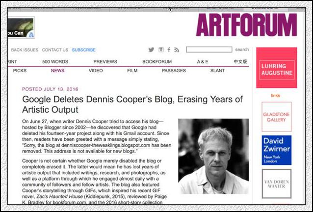 棲身在法國的美國藝術(shù)家丹尼斯·庫柏(Dennis Cooper)14年來發(fā)布在全球最大的互聯(lián)網(wǎng)平臺(tái)上的作品溘然消失了,他的谷歌博客、谷歌郵箱同時(shí)被刪除。 丹尼斯·庫柏從2002年起開始使用埃文·威廉姆斯創(chuàng)辦的博客平臺(tái)Blogger,2003年,谷歌收購了Blogger。今年6月底,庫柏發(fā)現(xiàn)他的博客被下線了。同時(shí),他發(fā)現(xiàn)自己的谷歌郵箱也被禁用了。 庫柏告訴聞名新聞網(wǎng)站 Fusion 記者伊森·切爾(Ethan Chiel),谷歌沒有給出任何刪除其博客與郵箱的理由。