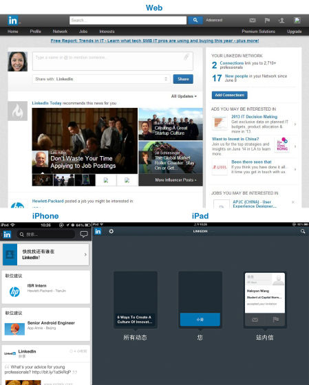 圖為 LinkedIn 的 Web、iPhone 和 iPad 版。 一、如何來規(guī)劃不同產(chǎn)品上的功能 在PC端有超大的屏幕,有鼠標(biāo)和鍵盤靈活的交互形式,其功能往往比較復(fù)雜,用戶能通過鼠標(biāo)指點(diǎn)的形式快速地完成各種任務(wù)。然而在PAD與手機(jī)端,屏幕能呈現(xiàn)的信息有限,交互形式也是精度相對較差的手勢形式,所有的這些都決定了在移動(dòng)真?zhèn)功能應(yīng)該做減法。 對于新產(chǎn)品來說,移動(dòng)優(yōu)先或者是移動(dòng)平等重要的產(chǎn)品規(guī)劃方式是及其重要的,獨(dú)立思索在移動(dòng)端能呈現(xiàn)的功能和內(nèi)容,讓設(shè)計(jì)師更清楚地看到產(chǎn)品的核心功能、內(nèi)容,有利于設(shè)計(jì)師掌握產(chǎn)品的方向。甚至可以考慮將移動(dòng)端優(yōu)先于PC端,PC的功能在移動(dòng)的功能基礎(chǔ)上去架構(gòu),它也不會(huì)脫離產(chǎn)品的核心價(jià)值。 PC 固有的特點(diǎn)在進(jìn)行復(fù)雜功能操縱時(shí)會(huì)更有上風(fēng)。那是不是復(fù)雜功能就直接轉(zhuǎn)移到 PC 上,而在手機(jī)上只展現(xiàn)簡樸功能呢?我覺得未必,要看產(chǎn)品的目標(biāo)用戶和產(chǎn)品特點(diǎn),有些產(chǎn)品用戶只更傾向于移動(dòng)端使用,甚至還有些使用本產(chǎn)品的用戶都沒有 PC。因此,在考慮用戶特性的基礎(chǔ)上,優(yōu)先規(guī)劃移動(dòng)真?zhèn)產(chǎn)品信息架構(gòu)。假如有些功能覺得轉(zhuǎn)移到 PC 上衡量過沒有題目,那我覺得可以進(jìn)行轉(zhuǎn)移,在移動(dòng)端凸起最核心的功能給用戶,并保持界面簡潔。 對于老產(chǎn)品,像淘寶網(wǎng)這樣的產(chǎn)品,其 PC 端本身及其復(fù)雜。那在產(chǎn)品設(shè)計(jì)時(shí),更多地思索在移動(dòng)端用戶的使用情景和核心功能,先去知足最核心的功能,知足有手機(jī)特色和移動(dòng)情景的功能。 二、設(shè)計(jì)上的差異在哪兒 當(dāng)前的設(shè)計(jì)手法在各個(gè)平臺(tái)、各種形態(tài)上都有融合的趨勢,在Web真?zhèn)設(shè)計(jì)也越來越客戶端化,很多Web App都讓人很難判定到底是HTML5做的仍是Native的。因此,在設(shè)計(jì)手法上的差異會(huì)越來越小。 然而,基于 PC、PAD、Phone的設(shè)備特性有較大的差異,PC 的指點(diǎn)操縱與PAD、Phone 的觸摸操縱有很大的不同,觸摸優(yōu)先的設(shè)計(jì)原則對移動(dòng)真?zhèn)設(shè)計(jì)有較大的匡助。其次,用戶的設(shè)備的機(jī)能和網(wǎng)絡(luò)特征千差萬別,在設(shè)計(jì)時(shí)需要去思索各自用戶使用的環(huán)境。再次,多設(shè)備用戶,在使用產(chǎn)品時(shí),如何進(jìn)行設(shè)備間的切換,如何銜接不同設(shè)備的操縱而不被丟棄都是設(shè)計(jì)師需要考慮的題目。 對于WAP與Native的設(shè)計(jì),主要關(guān)注瀏覽器的支持特性及Native上能施展的手機(jī)、各類傳感器的特性,這需要設(shè)計(jì)師拓寬思路去思索,好的設(shè)計(jì)能極大地晉升體驗(yàn)。 三、設(shè)計(jì)上的策略有哪些 從PC端到移動(dòng)真?zhèn)Web設(shè)計(jì)時(shí),響應(yīng)式設(shè)計(jì)是提得最多的方法。且在很多公司都有良多實(shí)踐。在淘寶,梓佑(編者注:淘寶資深 UED 總監(jiān))之前也一直在推動(dòng)響應(yīng)式的設(shè)計(jì),在一淘網(wǎng)、淘寶搜索等很多產(chǎn)品上都有實(shí)踐,總得來說對用戶體驗(yàn)起到了積極的作用。 然而我們看到的響應(yīng)式做得好的網(wǎng)站往往是結(jié)構(gòu)相對簡樸的博客類、新聞?lì)惥W(wǎng)站,這些頁面結(jié)構(gòu)簡樸,響應(yīng)規(guī)則輕易定制,前端實(shí)現(xiàn)也不復(fù)雜。而對于復(fù)雜的網(wǎng)頁的響應(yīng)式設(shè)計(jì),則都會(huì)碰到不少挑戰(zhàn),淘寶資深設(shè)計(jì)師,樂乘,在做玩客項(xiàng)目時(shí),總結(jié)了一套設(shè)計(jì)方案,值得參考。但是總的來說,復(fù)雜頁面是不是要使用響應(yīng)式還值得探討。 對于PC與移動(dòng)客戶端(App)的設(shè)計(jì)有何差異?成功移動(dòng)客戶端產(chǎn)品往往是基于用戶任務(wù)與使用情景進(jìn)行設(shè)計(jì),施展了手機(jī)的特性,使原本PC的功能得到更好地彌補(bǔ)與晉升。如大眾點(diǎn)評中的LBS使用戶能快速地發(fā)現(xiàn)四周的店鋪;微博能快速地上傳即時(shí)拍攝的照片,能隨時(shí)隨地的查詢等。 那WAP與客戶真?zhèn)上有什么側(cè)重呢?從使用情景上來講,這兩者是一致的。主要的側(cè)重有兩點(diǎn),其一是兩者的流量原來往往不一致,根據(jù)流量來源來區(qū)分用戶的特征,基于用戶特征的不同來使兩者在產(chǎn)品上的不同。其二是WAP上一些限制和上風(fēng),WAP上有很多功能還無法實(shí)現(xiàn),另外WAP有快速迭代的上風(fēng),也可以進(jìn)行一些項(xiàng)目的試錯(cuò)等。當(dāng)然,當(dāng)前WAP與客戶端也在融合,這也是一個(gè)方向,跟著HTML5等技術(shù)的成熟,兩者的融合是早晚的事情。 最后,移動(dòng)互聯(lián)網(wǎng)的時(shí)代已經(jīng)來臨,移動(dòng)用戶的體量也會(huì)越來越超越PC,在進(jìn)行產(chǎn)品設(shè)計(jì)時(shí),思索移動(dòng)平臺(tái)是必定的,如何能進(jìn)行更好地全平臺(tái)設(shè)計(jì),還有待業(yè)內(nèi)人士更多地探討。記得幾年前,我非常信仰移動(dòng)真?zhèn)產(chǎn)品應(yīng)該是PC的增補(bǔ),現(xiàn)