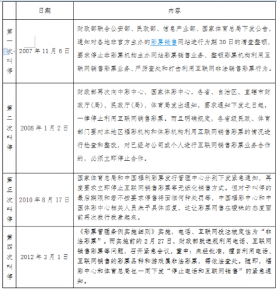 2月25日,國(guó)家體育總局發(fā)布《體育總局關(guān)于切實(shí)落實(shí)彩票資金專項(xiàng)審計(jì)意見加強(qiáng)體育彩票治理工作的通知》,受該通知的影響,部門省級(jí)彩票治理中央從2015年2月25日起暫停接受互聯(lián)網(wǎng)彩票銷售訂單,公司無紙化彩票代購(gòu)業(yè)務(wù)從2015年2月25日開始暫時(shí)休止,詳細(xì)恢復(fù)時(shí)間待定。 2月25日,國(guó)家體育總局發(fā)布《體育總局關(guān)于切實(shí)落實(shí)彩票資金專項(xiàng)審計(jì)意見加強(qiáng)體育彩票治理工作的通知》,受該通知以及財(cái)政部、民政部和體育總局聯(lián)合下發(fā)的《關(guān)于開展擅自利用互聯(lián)網(wǎng)銷售彩票行為自查自糾工作有關(guān)題目的通知》的影響,部門省級(jí)彩票治理中央從2015年2月25日起暫停接受互聯(lián)網(wǎng)彩票銷售訂單,公司無紙化彩票代購(gòu)業(yè)務(wù)從2015年2月25日開始暫時(shí)休止,詳細(xì)恢復(fù)時(shí)間待定。 對(duì)于涉及互聯(lián)網(wǎng)彩票業(yè)務(wù)的上市公司來說,受《通知》影響,我國(guó)唯逐一個(gè)在美國(guó)納斯達(dá)克上市的互聯(lián)網(wǎng)彩票銷售概念股“500彩票網(wǎng)”股價(jià)單日暴跌22.37%,盤中最低到達(dá)9.55美元,已不足歷史最高價(jià)的五分之一。繼500彩票網(wǎng)停售4種高頻彩后,阿里、騰訊、人民網(wǎng)旗下互聯(lián)網(wǎng)售彩平臺(tái)也接踵公布暫停全部或部門彩種的銷售。