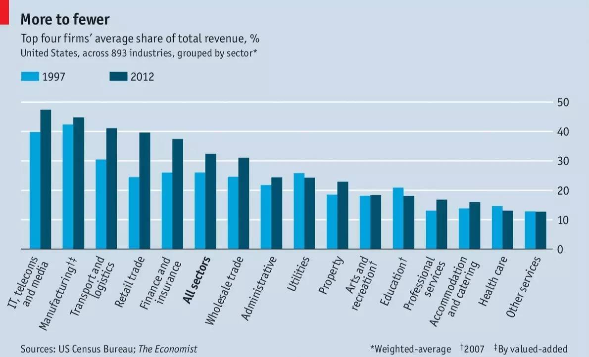 收入的不平等進(jìn)一步加重 盡管如此,別的專(zhuān)家的研討還顯現(xiàn),跟著市場(chǎng)集中度越來(lái)越高,市場(chǎng)位置高的公司越來(lái)越強(qiáng),草創(chuàng)公司取得成功的才能也更加降低。因?yàn)閷?duì)折新增就業(yè)崗位都發(fā)源自成功的草創(chuàng)公司,這種狀況也按捺了新就業(yè)時(shí)機(jī)的發(fā)生。 彼得·歐爾薩格(Peter Orszag)曾在《彭博視角》(Bloomberg View)節(jié)目撰文指出,超級(jí)明星公司取得遠(yuǎn)超正慣例劃的出資報(bào)答,進(jìn)一步加重收入上的不平等,也就家常便飯了。歐爾薩格與貝拉克·奧巴馬(Barak Obama)總統(tǒng)任內(nèi)的經(jīng)濟(jì)參謀委員會(huì)主席賈森·富爾曼(Jason Furman)一起指出,本錢(qián)報(bào)答率的進(jìn)步并沒(méi)有帶來(lái)對(duì)公司出資添加——這是獨(dú)占力氣構(gòu)成的另一表現(xiàn)。 反獨(dú)占滯后 有些芝加哥學(xué)派成員對(duì)此表明附和。該學(xué)派是現(xiàn)代反獨(dú)占理論的源頭。20世紀(jì)70到80年代,芝加哥大學(xué)的一群專(zhuān)家經(jīng)過(guò)論辯顛覆了反獨(dú)占法。他們以為,并購(gòu)發(fā)生的經(jīng)濟(jì)效率進(jìn)步,其好處足以跨越對(duì)公司規(guī)劃的任何憂(yōu)慮。例子觸及消費(fèi)者福祉:并購(gòu)是不是給兼并后的公司帶來(lái)進(jìn)步消費(fèi)者報(bào)價(jià)的權(quán)利,以及并購(gòu)后職業(yè)準(zhǔn)入門(mén)檻是不是會(huì)高到新來(lái)者無(wú)法輕松跨越的程度?美國(guó)反獨(dú)占法的執(zhí)法者們發(fā)生了不堅(jiān)定。從1970到1999年,美國(guó)每年均勻提交15.7起反獨(dú)占訴訟案。這以后這一數(shù)字一路降低,2000到2014年間降至了缺乏3起。