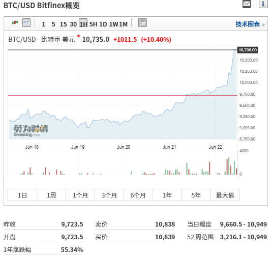6月22日,比特幣打破10000美元關(guān)口,這是自去年3月后,比特幣價格重回10000美元高位,到發(fā)稿,比特幣已漲至10735美元。