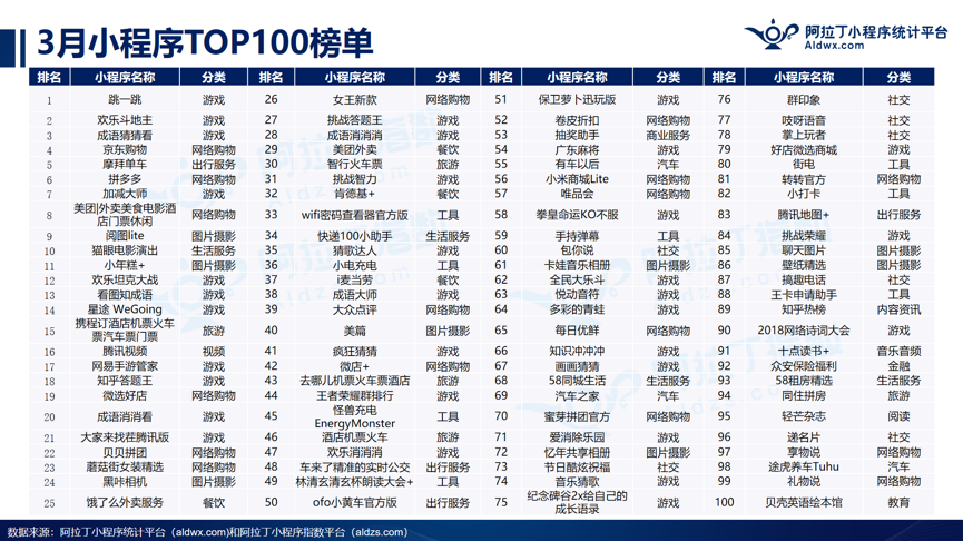 2018年4月18日,阿拉丁小程序核算途徑和阿拉丁指數(shù)一同發(fā)布了2018年3月TOP100小程序榜單。阿拉丁核算途徑和阿拉丁指數(shù)在榜單的實(shí)時(shí)性、算法、樣本數(shù)量、多職業(yè)維度(添加了小程序游戲、外交、轎車、圖片拍照等)四個(gè)方面進(jìn)行了全面晉級(jí)。