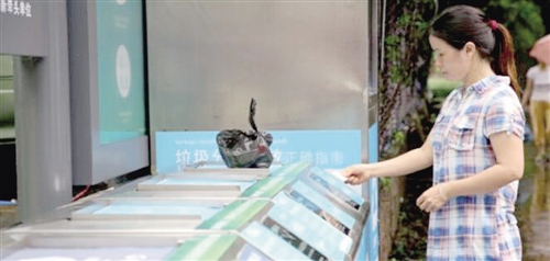 圖為廣東省廣州市海珠區(qū)輕工學(xué)院內(nèi)的智能廢物分類桶。廢物放到桶上面會自動掉下去,市民刷卡后會對應(yīng)得到積分。 (材料圖像) 如今,我