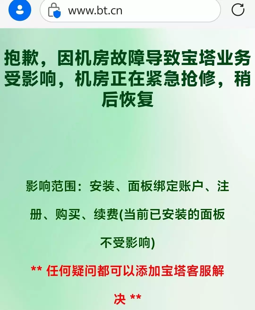 8 月 9 日消息,Linux / Windows 服務(wù)器運維管理面板軟件 —— 寶塔面板官網(wǎng)今日發(fā)布通知: 因機(jī)房故障導(dǎo)致寶塔業(yè)務(wù)受影響,