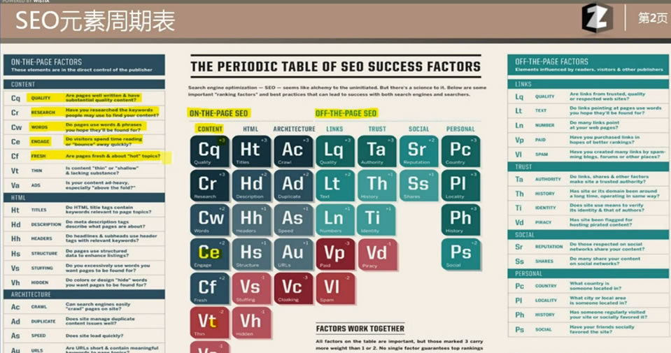 首先咱們要搞清楚怎么看這個(gè)周期表,它其實(shí)就是化學(xué)元素周期表的描摹,用可視化規(guī)劃體現(xiàn)出查找引擎優(yōu)化元素對于整個(gè)算法系統(tǒng)的重要性。