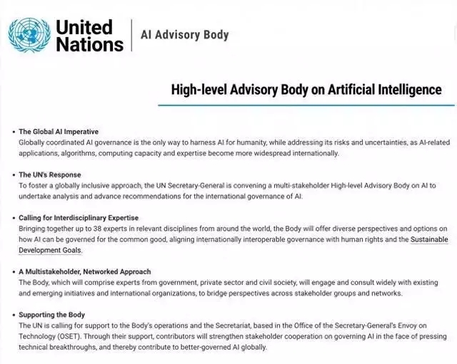 聯(lián)合國成立39人咨詢顧問團(tuán)隊(duì)以解決人工智能國際治理問題。 聯(lián)合國成立了一個(gè)由39人組成的咨詢顧問團(tuán)隊(duì),以解決人工智能國際治理問題。該團(tuán)隊(duì)由來自世界各地的專家組成,