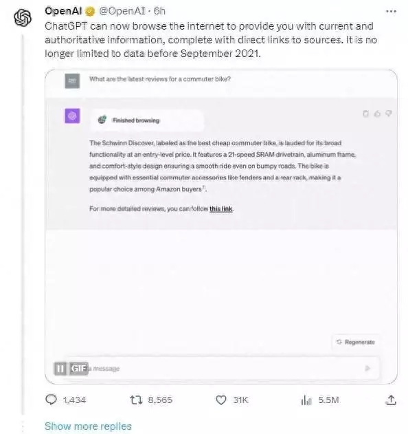 9月28日 消息:OpenAI今日宣告,ChatGPT現(xiàn)在可以閱讀互聯(lián)網(wǎng),供給最新、最權威的信息,并直接鏈接到源。它不再局限于2021年9月以前的數(shù)據(jù)。