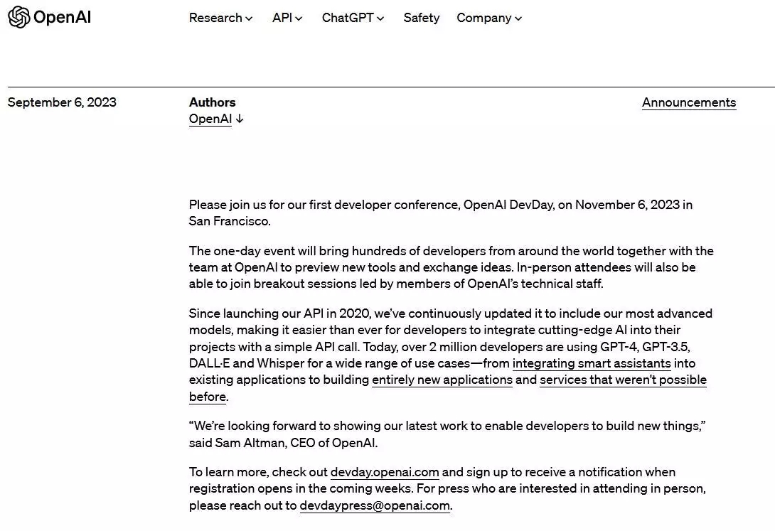 9月7日電 當地時間6日,美國人工智能公司OpenAI在官網發(fā)布公告稱,將于11月6日在舊金山舉辦公司的首屆開發(fā)者大會。 公告介紹,