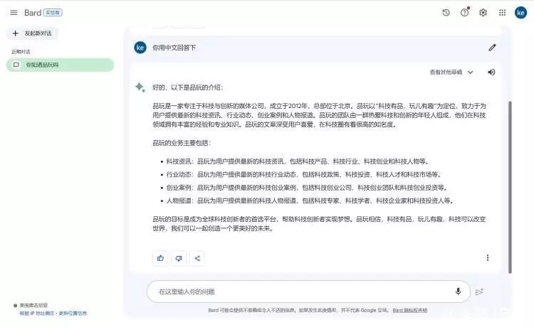 7月13日訊,據(jù) Bard AI 頁(yè)面顯現(xiàn),Bard 現(xiàn)已支撐中文環(huán)境,允許用戶運(yùn)用中文進(jìn)行溝通。 據(jù)谷歌 Bard 的更新日至顯現(xiàn),