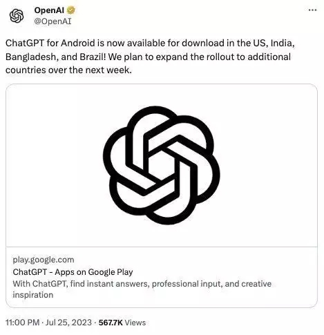 7月26日訊,OpenAI經(jīng)過其官方推特宣告,安卓版ChatGPT現(xiàn)在在美國(guó)、印度、孟加拉國(guó)和巴西供給下載,并計(jì)劃在下周將其推行至更多國(guó)家。