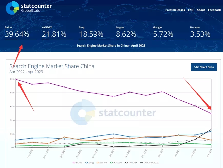 我國的查找引擎商場正在發(fā)生巨變。據(jù)美國一家網(wǎng)站流量檢測組織StatCounte顯現(xiàn):從2022年到2023年,百度的查找流量比例急劇下降至39.64%,
