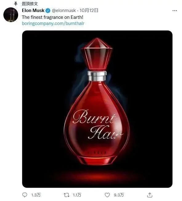 造飛船的馬斯克,仍有閑情逸致賣香水。 近日,馬斯克在個(gè)人交際渠道上發(fā)布一款名為“燒焦頭發(fā)(Burnt Hair)”的香水,