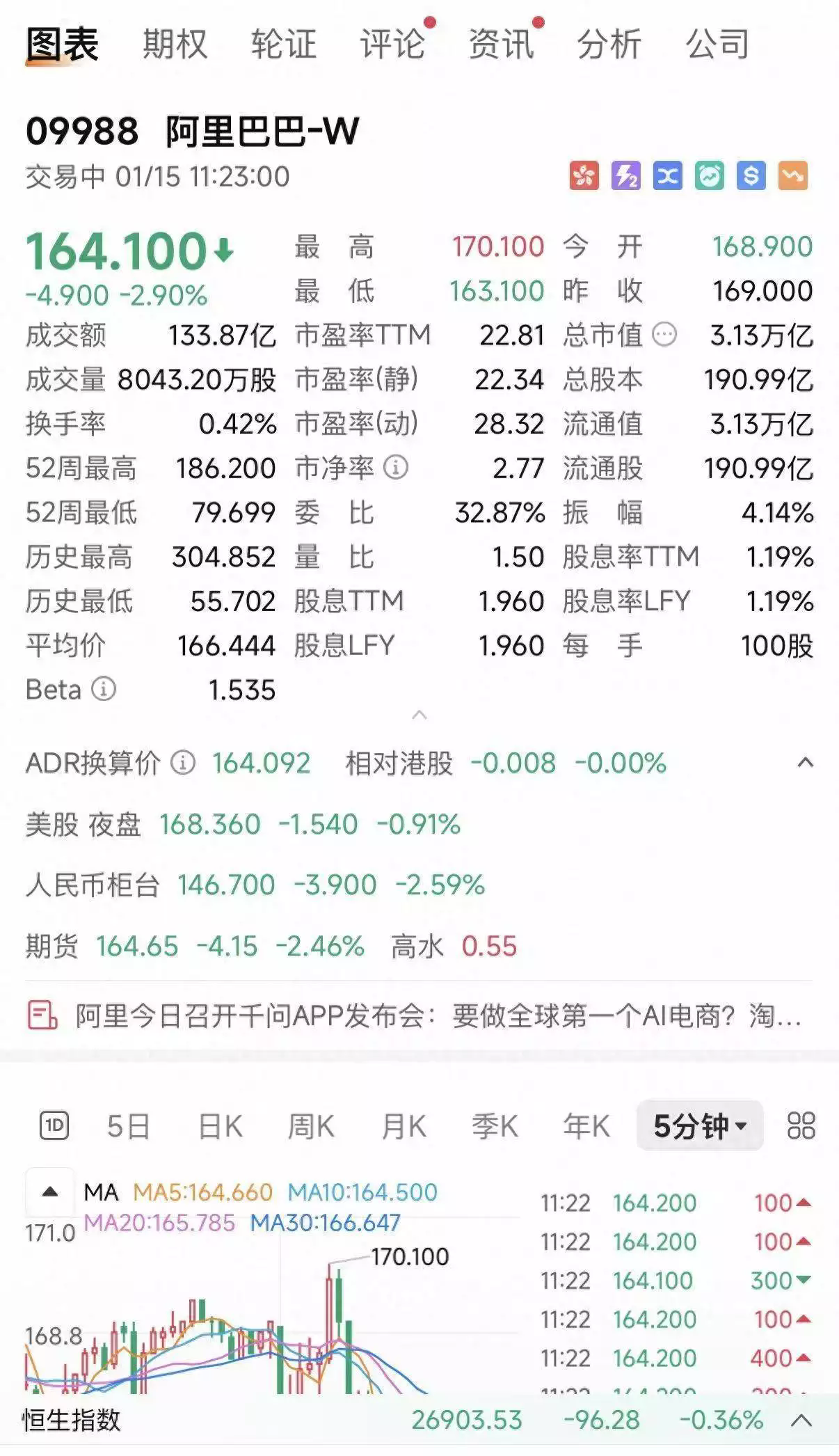 阿里巴巴港股今日(以您看到信息的時間為基準,通常指最近一個交易日)下跌近3%,這通常是市場對公司近期動態(tài)、行業(yè)環(huán)境或宏觀經(jīng)濟因素的直接反應(yīng)。