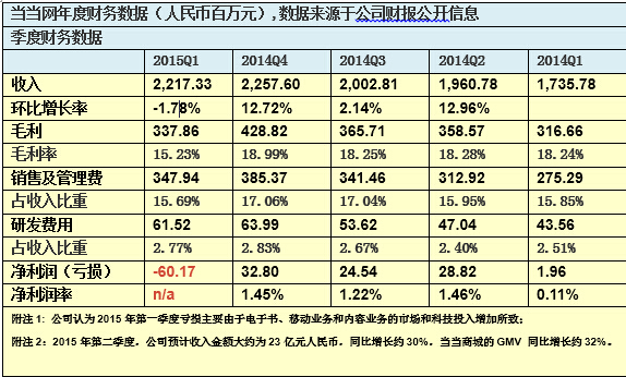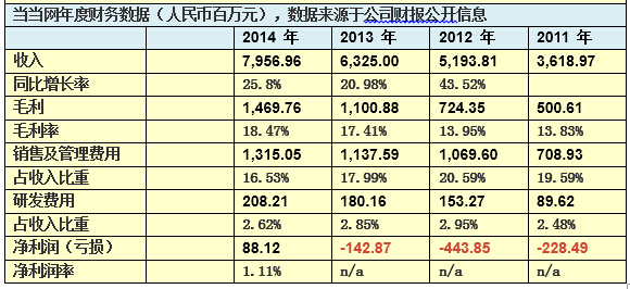 我們再看一下公司的業(yè)績表現(xiàn),以下表格是當(dāng)當(dāng)網(wǎng)的相關(guān)歷史財務(wù)數(shù)據(jù),從中可發(fā)現(xiàn)幾個比較顯著的特征: -這是一家業(yè)務(wù)比較穩(wěn)健的公司,各項比率在不同會計期間都比較不亂; -公司的業(yè)務(wù)也呈現(xiàn)穩(wěn)步增長的態(tài)勢; -2014年是第一年泛起全年盈利年份,主要仍是得益于規(guī)模的增長; -2015年第一季度重大虧損,主要由于電子書、移動和內(nèi)容業(yè)務(wù)的投入導(dǎo)致毛利下滑; 假如從資產(chǎn)負債角度看,截止2015年3月31日確當(dāng)當(dāng)網(wǎng)總資產(chǎn)約46億元人民幣,凈資產(chǎn)約6億元人民幣,現(xiàn)金及等價物(含短期投資)余額約為16.4億元人民幣,資產(chǎn)負債率接近87%,但資產(chǎn)的質(zhì)量仍是不錯的, 以活動資產(chǎn)為主。但因為凈資產(chǎn)總量偏低(近6億多人民幣),假如采取激進經(jīng)營戰(zhàn)略又無法盈利的情況下,可能會導(dǎo)致凈資產(chǎn)為負數(shù),因此穩(wěn)健的經(jīng)營戰(zhàn)略是個現(xiàn)實的選擇。但可能正由于如斯,假如不考慮并購的整合效應(yīng),當(dāng)當(dāng)網(wǎng)的估值也會受一定程度的到負面影響。 從現(xiàn)金流角度看,2014年和2013年連續(xù)兩年的經(jīng)營流動現(xiàn)金流都是正數(shù),分別為2.65億和2.73億元人民幣。 所以從歷史數(shù)據(jù)來看,可以預(yù)計2015年當(dāng)當(dāng)網(wǎng)的收入規(guī)模會突破100億元人民幣的規(guī)模,基于公司歷史的穩(wěn)健經(jīng)營風(fēng)格和治理層在最新季度業(yè)績公告上所宣稱的對將來業(yè)績頗為樂觀,其業(yè)績猜測和估值水平到底應(yīng)該是多少才是公道和公允?