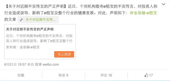 圖片來自無界新聞 昨天晚上開始,e租寶官網(wǎng)、APP均無法正常打開,一度引發(fā)了投資人的恐慌。e租寶官方微博稱是為了“防止不實傳言引發(fā)恐慌和無序贖回、提現(xiàn),本著保護客戶資金安全、平臺交易安全的原則,e租寶平臺主動向社會各界公布暫停平臺交易。” 為解答投資人普遍擔心的資金安全題目,e租寶的客戶經(jīng)理向他們群發(fā)短信表示“團體在調查期間,主動封鎖凍結了中信銀行風險保證金11億和足以籠蓋剛性兌付的應兌付客戶本金和收益”。 但是!今天中信銀行出來打臉了!據(jù)網(wǎng)易財經(jīng)報道,中信銀行稱“e租寶在中信銀行并無風險備用金賬戶,僅開立活期賬戶余額0元!” 知道真相的投資者們眼淚有沒有掉下來?