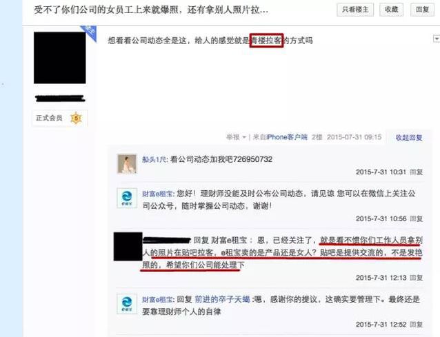 另外,鈺誠團體成立的人武部也被該員工稱為是鈺誠彈壓上門討要工資員工的黑社會組織,鈺誠的董事長丁寧要下屬稱其為“丁主席”,稱總經(jīng)理魏引忠為“政委”。搜索百度百科,人武部即人民武裝部是我國在縣(旗,縣級市、市轄區(qū))、鄉(xiāng)(鎮(zhèn))和大中型廠礦、大專院校設立的軍事工作部分,企業(yè)中固然也有設立人武部的但都是國有大中型企業(yè),像鈺誠團體這樣的中外合資公司是否有資格成立人武部,相信良多人心中都會存有迷惑,但是當時人武部成立揭牌典禮的時候,當?shù)剀姺謪^(qū)領導、市區(qū)政府領導、人武部相關領導及全國多家媒體均有出席,還有良多報道稱之積極支持國防建設。 小插曲 打開e租寶的百度貼吧就可以看到一種與公司高大上不相符的氣質,良多都是所謂的新入人員工爆照。