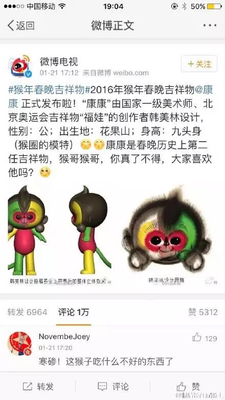 也難怪在央視發(fā)布吉利物的半個(gè)小時(shí)內(nèi),評(píng)論就已經(jīng)由萬(wàn),微博話題#猴年春晚吉利物#三個(gè)小時(shí)閱讀量就達(dá)811萬(wàn),討論5.3萬(wàn),登上微博排行榜第一名。