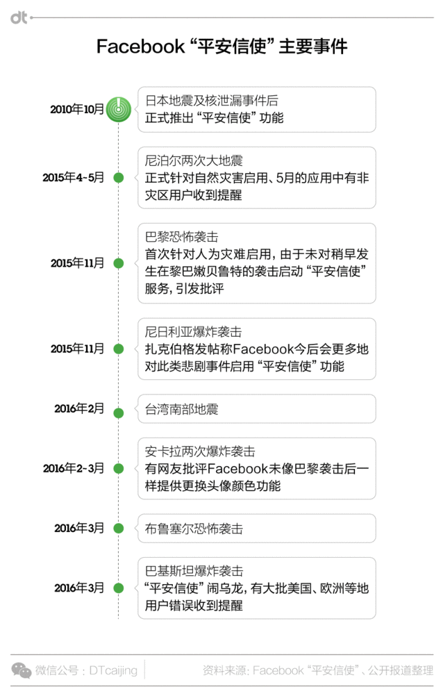 (圖片來源:Facebook平安信使頁面) “平安信使”已經(jīng)推出了若干次盡管“平安信使”從推出到現(xiàn)在發(fā)生了一些烏龍,還由于這個功能涉及到定位追蹤和個人隱私的保護,也引發(fā)多次爭議。 不外這項服務(wù)的推出仍舊受到了良多歡迎,并且為實際救援提供了作用。 Facebook是第一個在大型災害事故上系統(tǒng)推出報平安服務(wù)的社交媒體。災害事件發(fā)生的時候,通信常常不暢,受影響地區(qū)的用戶會接收到大量的和災害相關(guān)的信息以及親朋摯友的關(guān)心,傳統(tǒng)的通信方式效率低下,而龐大的社交網(wǎng)絡(luò)則是提供這一公共服務(wù)的最佳平臺。同時,你也可以看到自己摯友的報平安狀態(tài),以確定他們所處的情況。 這一功能最初是受日本地震及核泄漏事件啟發(fā),起初只是針對天然劫難。而去年巴黎恐怖襲擊后,F(xiàn)acebook首次針對人為災害啟用平安信使,據(jù)Facebook自己公然的數(shù)據(jù),410萬用戶在巴黎襲擊后24小時內(nèi)匯報了平安,占了巴黎總?cè)丝诘慕种。這些報平安的帖子經(jīng)由大量傳播,終極看過報平安狀態(tài)的用戶數(shù)達到3.6億之多。