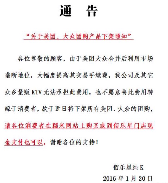 動靜是從一個名為“省娛協(xié)會商討群”的微信聊天截圖爆出來的,當(dāng)事者為武漢KTV商家表示,新美大合并后,將原來的手續(xù)費(fèi)由2%漲到12%,商家在討論群里集體表示,在團(tuán)購的影響下,業(yè)務(wù)利潤已經(jīng)很低了,再多收取抽成點,獲得收益甚至不足以支撐基本糊口。