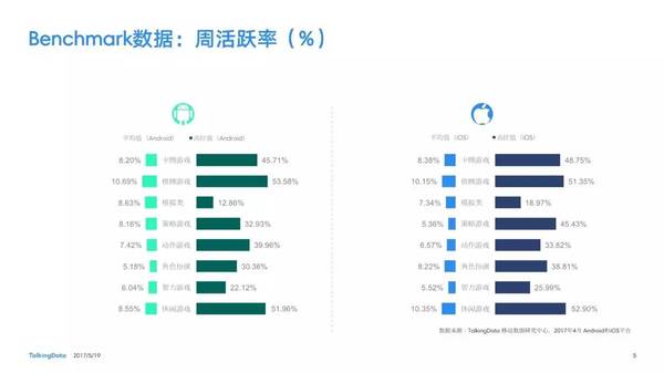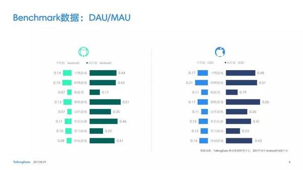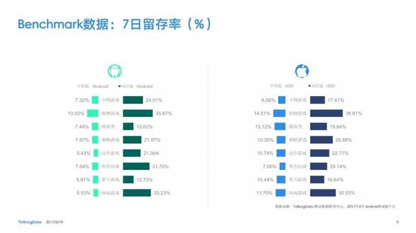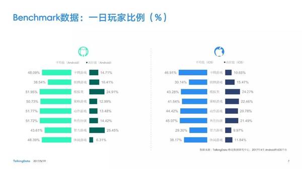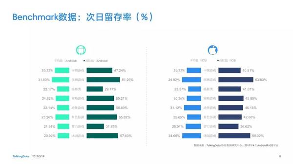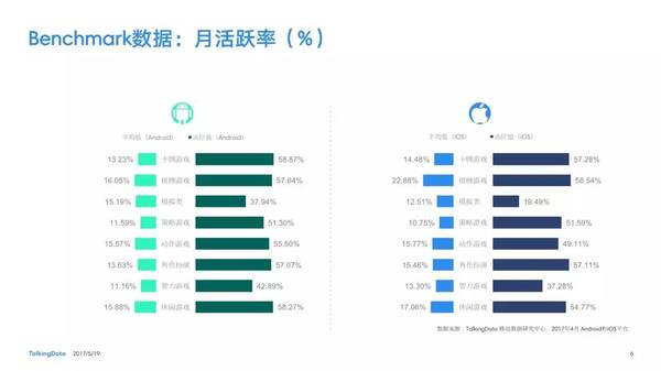 付費(fèi)率:2017年4月,移動游戲在Android和iOS渠道的付費(fèi)率保持安穩(wěn),其間,角色扮演、動作和戰(zhàn)略等偏重度類型移動游戲的付費(fèi)率環(huán)比上月略有降低; 用戶活潑度:2017年4月,Android和iOS渠道移動游戲用戶的活潑度(Dau/Mau)全體保持安穩(wěn)運(yùn)轉(zhuǎn)態(tài)勢,其間,iOS渠道角色扮演類移動游戲的周活潑率環(huán)比增加13.5%,月活潑率環(huán)比增加1.2%; 用戶留存率:2017年4月,移動游戲用戶在Android和iOS渠道的用戶留存狀況有升有降;iOS渠道棋牌類移動游戲的一日玩家份額比較上月增加2.2%,而其次日留存率比較上月降低6.7%,7日留存率則比較上月降低11.4%; 運(yùn)用時長&次數(shù):2017年4月,移動游戲用戶的日均游戲次數(shù)在Android和iOS渠道整體有所增加,其間,休閑、卡牌類移動游戲的日均游戲次數(shù)的增幅相對較高;移動游戲用戶的均勻運(yùn)用時長在Android渠道保持安穩(wěn),而在iOS渠道略有降低。 |