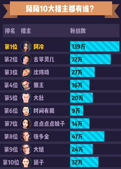 陌陌在2016年選舉了年度10大主播,依據(jù)陌陌提供的資料顯現(xiàn),人氣最高的阿冷粉絲數(shù)量在139萬,剩余的主播粉絲量級(jí)均未過百萬。