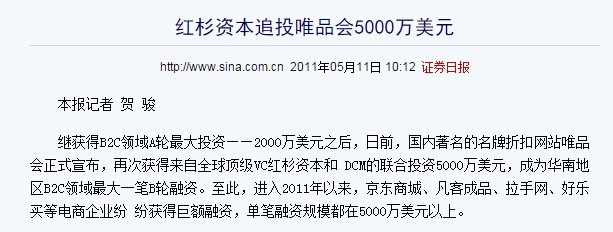 圖7:2007年7月26日,B輪融資,向IDG增發(fā)B輪優(yōu)先股5,643,990股,每股0.8859美元,對價為500萬美元。 第五名、 唯品會灌水近900萬報道融資額:5000萬美元 真實(shí)融資額:4120萬美元 2011年5月,唯品會公布獲得紅杉資本和DCM的聯(lián)合風(fēng)險投資5000萬美元。有趣的是,為了能給自身項目冠以“最大的”稱號,公關(guān)部分使用了“華南地區(qū)”這樣的定語。 以下為媒體報道截圖:
