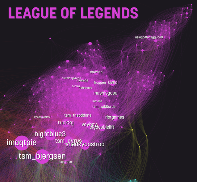 上圖是聞名游戲視頻網(wǎng)站Twitch釋出的游戲觀眾關(guān)系圖。圖中每一個(gè)圓點(diǎn)都代表一個(gè)實(shí)況臺(tái),圓點(diǎn)的大小代表觀眾數(shù)多少,而點(diǎn)與點(diǎn)之間連線的疏密及是非代表這些實(shí)況臺(tái)之間共享觀眾的程度,因此可以從這些連線來(lái)觀察各類游戲觀眾的交集。我們可以顯然地看出兩個(gè)現(xiàn)象: 1.大多數(shù)游戲之間的觀眾共享程度很高,等于說(shuō)良多游戲的觀眾是一會(huì)兒觀看這個(gè)游戲一會(huì)兒觀看那個(gè)游戲的,包括英雄同盟、爐石傳說(shuō)、魔獸世界等聞名游戲皆在此列。 2.以DotA2和坦克世界為代表的觀眾群遺世而獨(dú)立,游戲擁有極強(qiáng)的獨(dú)有性。 我們?cè)賮?lái)看兩張更具體的對(duì)比: