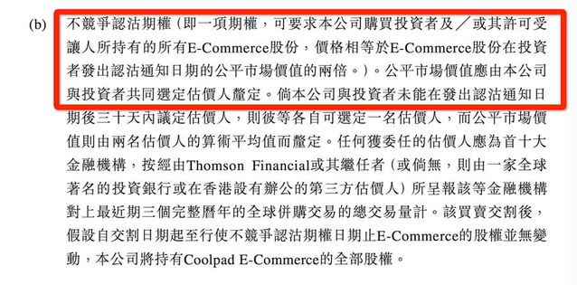圖4 那么360和酷派的“認(rèn)沽權(quán)”是怎么劃定的呢?可以看出,假如雙方劃定了兩種方式“不競爭認(rèn)購期權(quán)”和“不競爭認(rèn)沽期權(quán)”(圖5),并且分別劃定了相應(yīng)的權(quán)利和義務(wù)(圖6-圖8),尤其是圖7,非常具體的劃定了假如違背“不競爭認(rèn)沽期權(quán)”的內(nèi)容,即酷派不得直接或間接于中國或美國“在與受限制業(yè)務(wù)相同或相似或與之競爭的任何業(yè)務(wù)中擁有任何權(quán)益、治理、控制、介入、咨詢、提供服務(wù)或以其他方式從事,或從事協(xié)助”,而眾所周知的是,2015年6月28日,酷派發(fā)布的《控股股東出售股份公告》顯示,郭德英家族通過信托計劃持股的Data Dreamland以3.508港元每股的對價向樂視聯(lián)系關(guān)系公司出售7.8038億股,占已發(fā)行總股本的18%,后者曾經(jīng)推出了多款手機產(chǎn)品,與360、酷派合資的奇酷科技的業(yè)務(wù)線重疊嚴(yán)峻,顯然,酷派這是演了一出“一女嫁二夫”的小算盤,但是卻健忘了當(dāng)初與360簽署的協(xié)議,以及必需履行的義務(wù)。