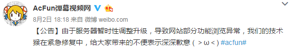 A站2016年8月2日就在官方微博上表示,因為A站服務器暫時性調整進級,導致網站部門功能瀏覽異常,A站的技術職員在緊急修復中,給大家?guī)淼牟槐惚硎旧钌钋敢狻?/p>