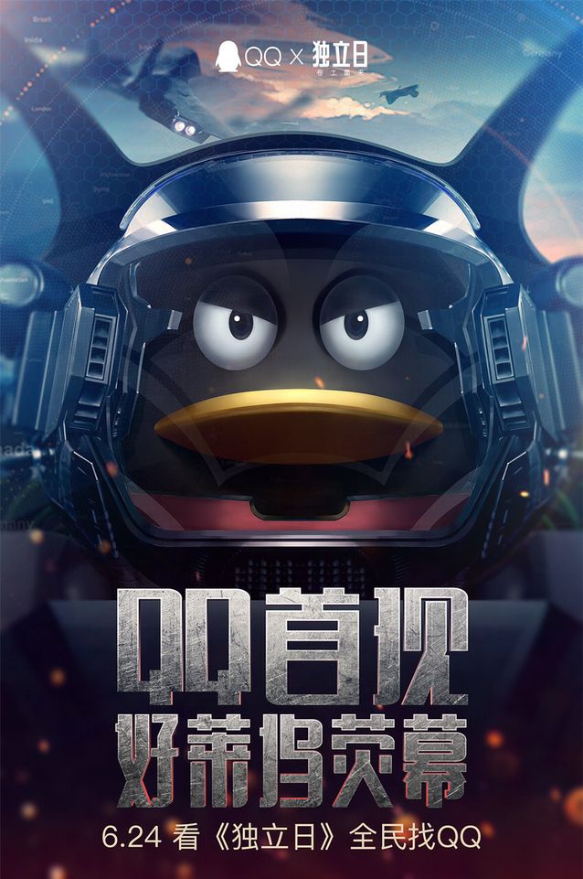 6月24日,時隔20年重啟的好萊塢科幻災(zāi)害巨片《獨(dú)立日·卷土重來》登陸中國大陸院線。影片男女主角進(jìn)行地月通話,結(jié)束時電腦屏幕顯示QQ企鵝